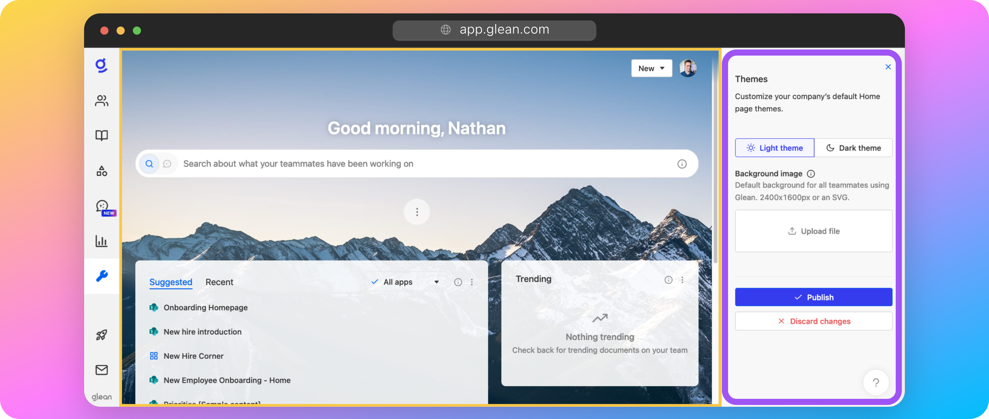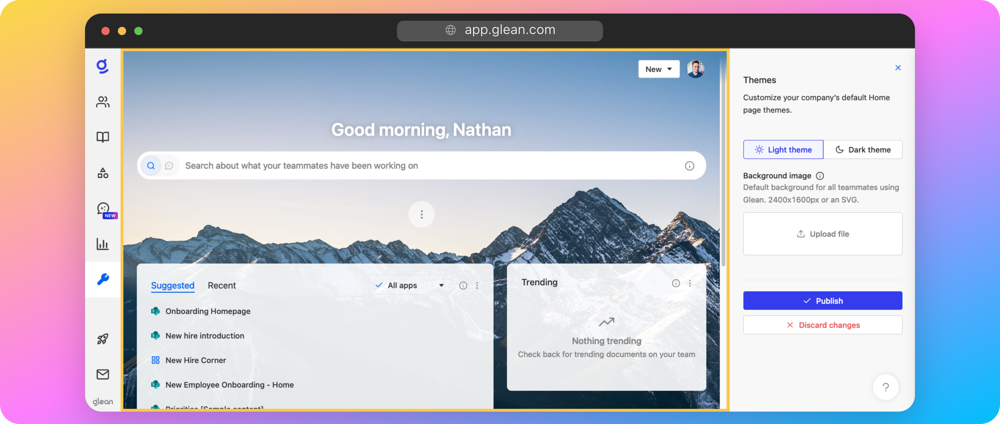 The Themes menu is where you can customize the default background image that is used for all users at your company when they first access the Glean. Users who have set their background from Glean's library will not have their choices affected by any change in the default background.