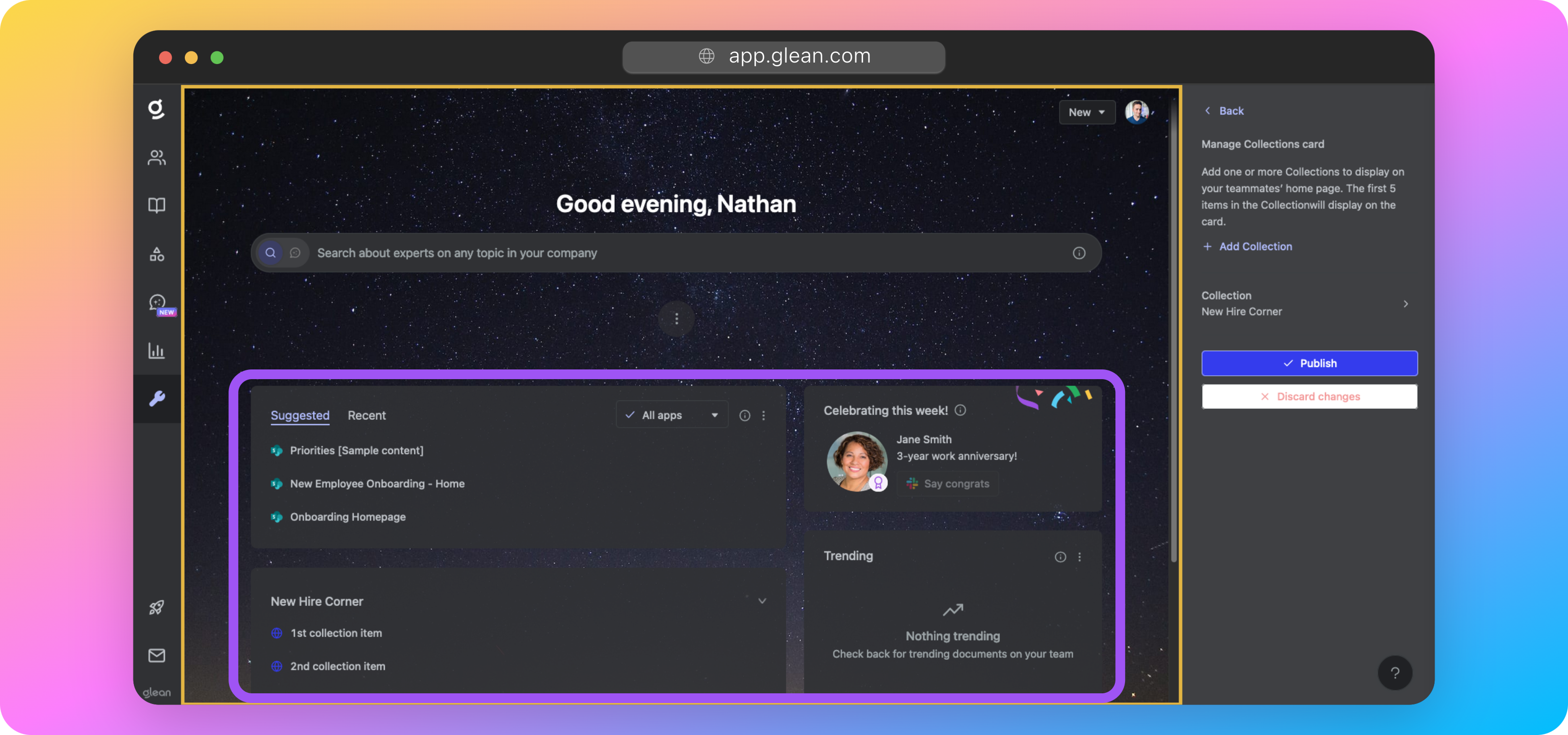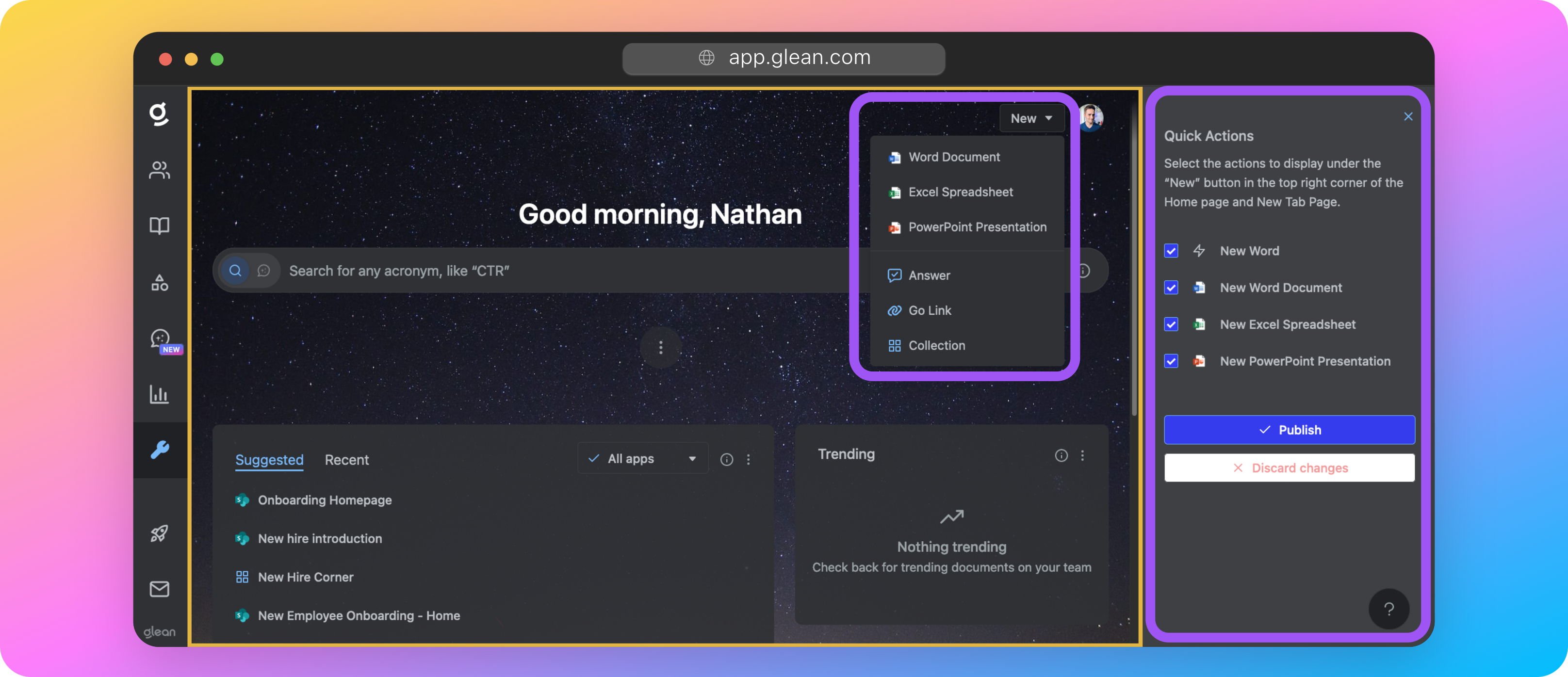 Cards are the sections that are visible on the Glean home page for each of your users. These can include suggested documents, collections, and people celebrations. - Quick Actions: