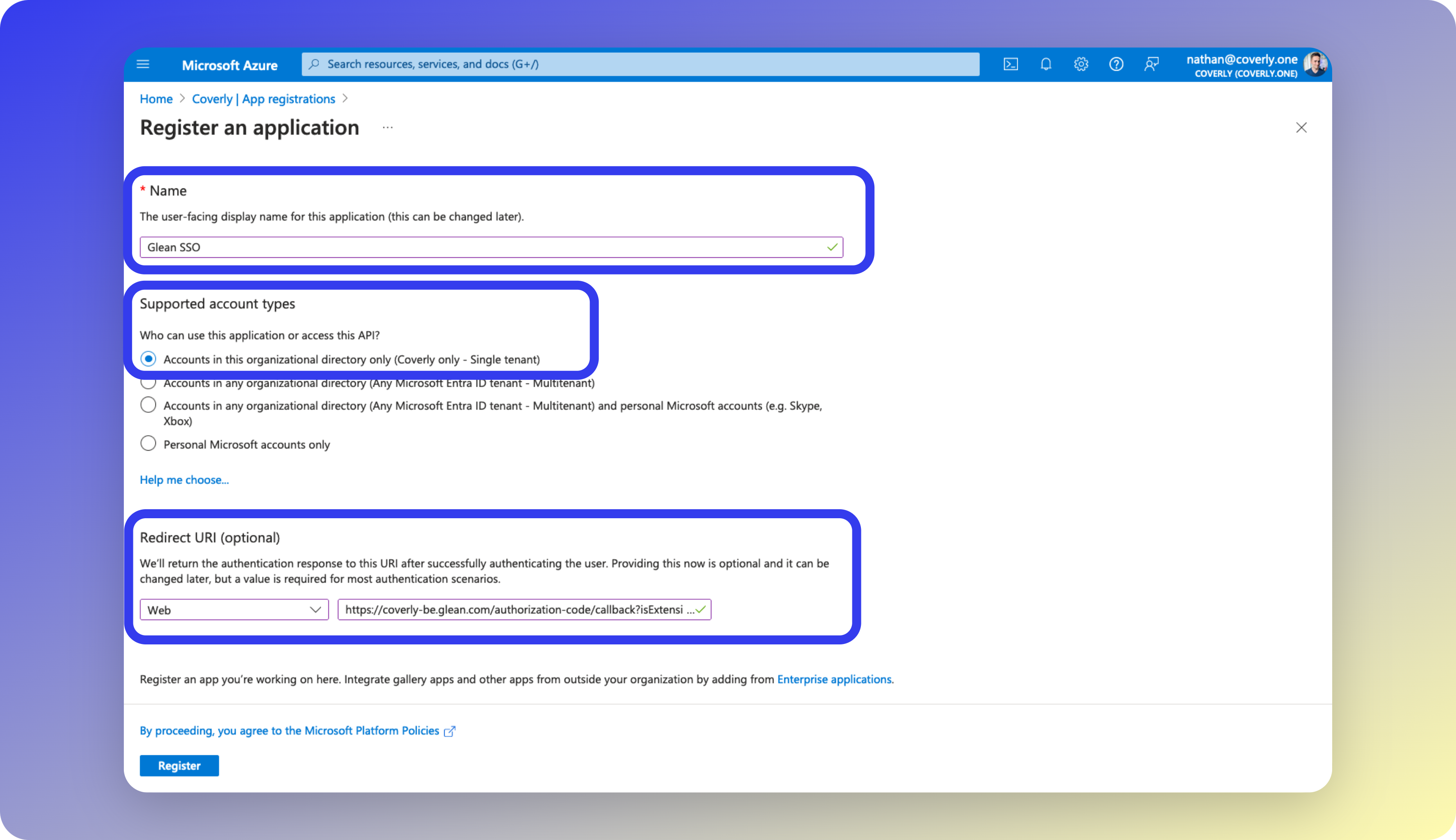 Create a new App Registration in the Entra ID portal to complete the SSO integration and synchronize your user directory with Glean.