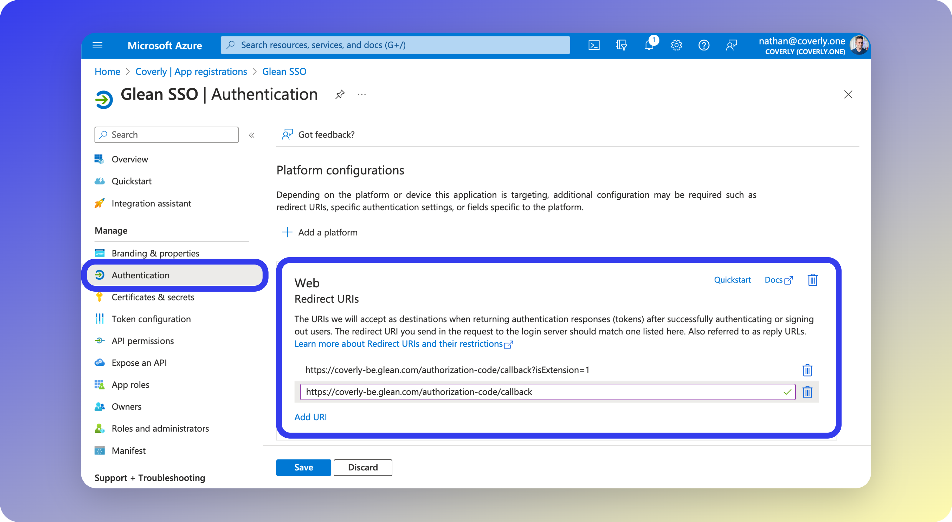 Once the App Registration for Glean SSO has been created, select Authentication from the left sidebar menu.