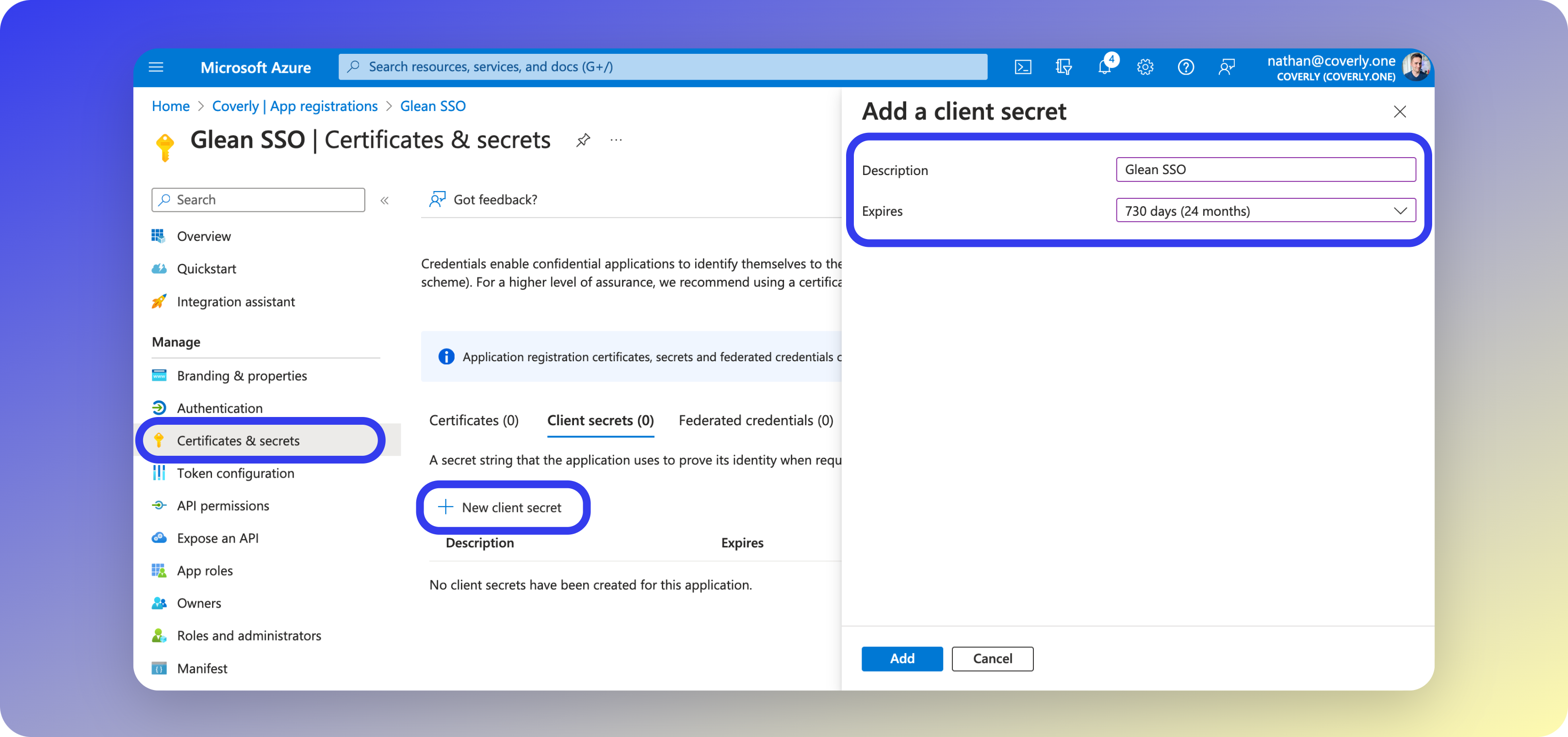 Next, you will create a secret token that Glean will use to access the Microsoft Graph API.