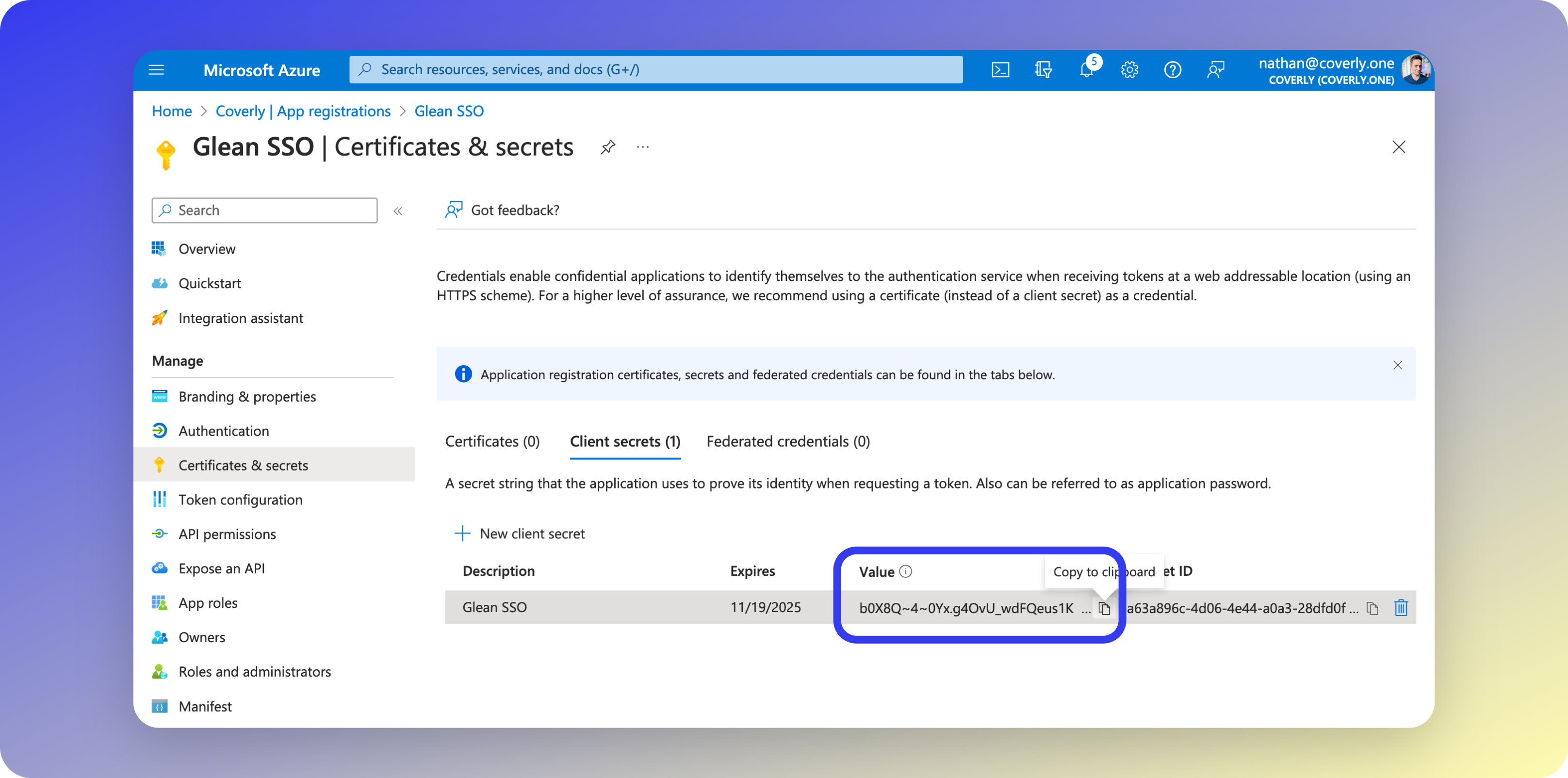 Under the Client secrets section, copy the Value (not the Secret ID). You will need this later when configuring Glean.