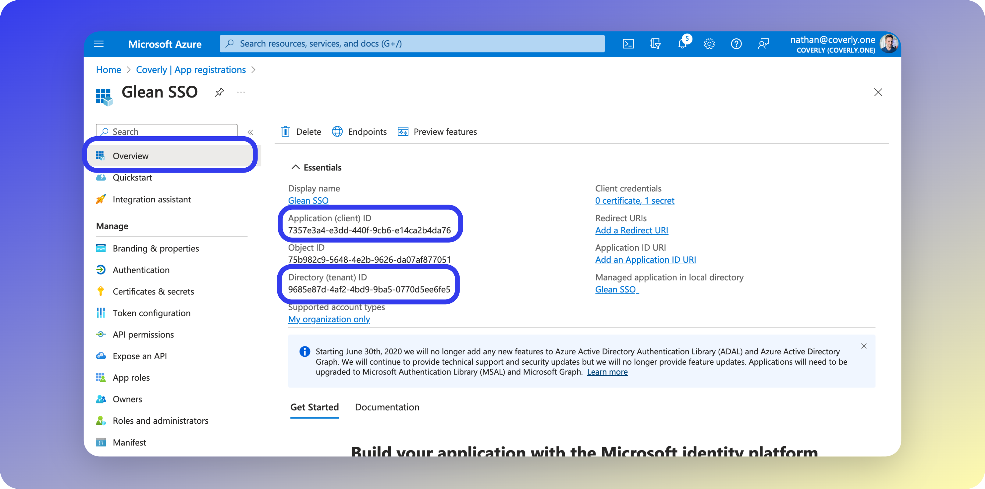 Copy both the Application (client) ID and the Tenant (directory) ID. You will need these later when configuring Glean.