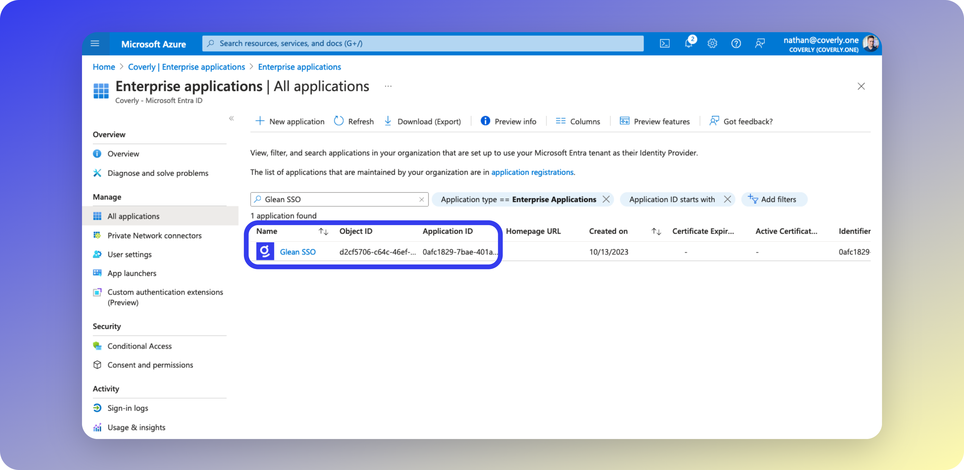 Creating the App Registration for Glean also creates a corresponding Enterprise Application, called Glean SSO. Select Glean SSO from your list of Enterprise Apps.