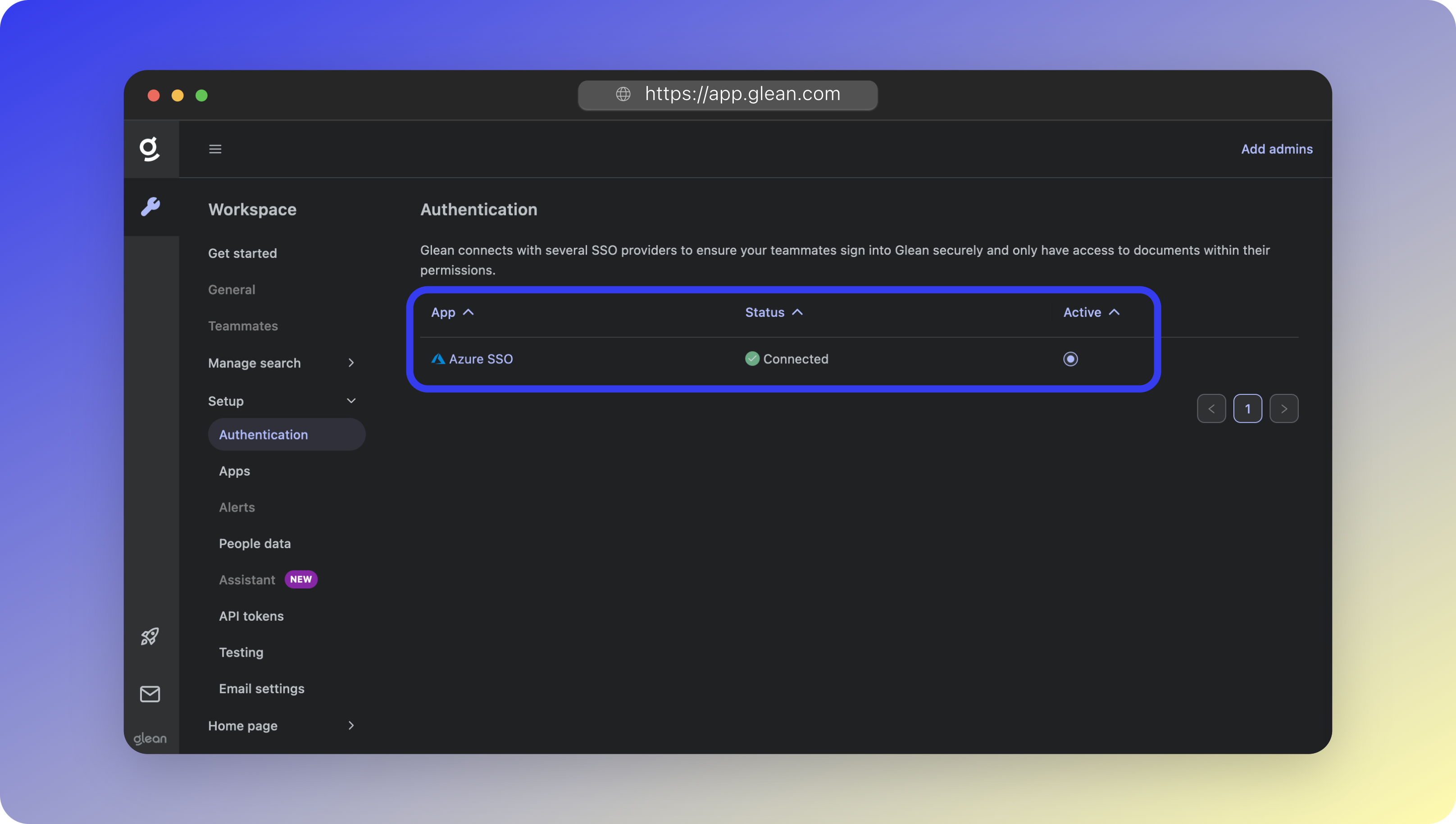 - In the Glean UI, navigate to Workspace Settings > Setup > Authentication.