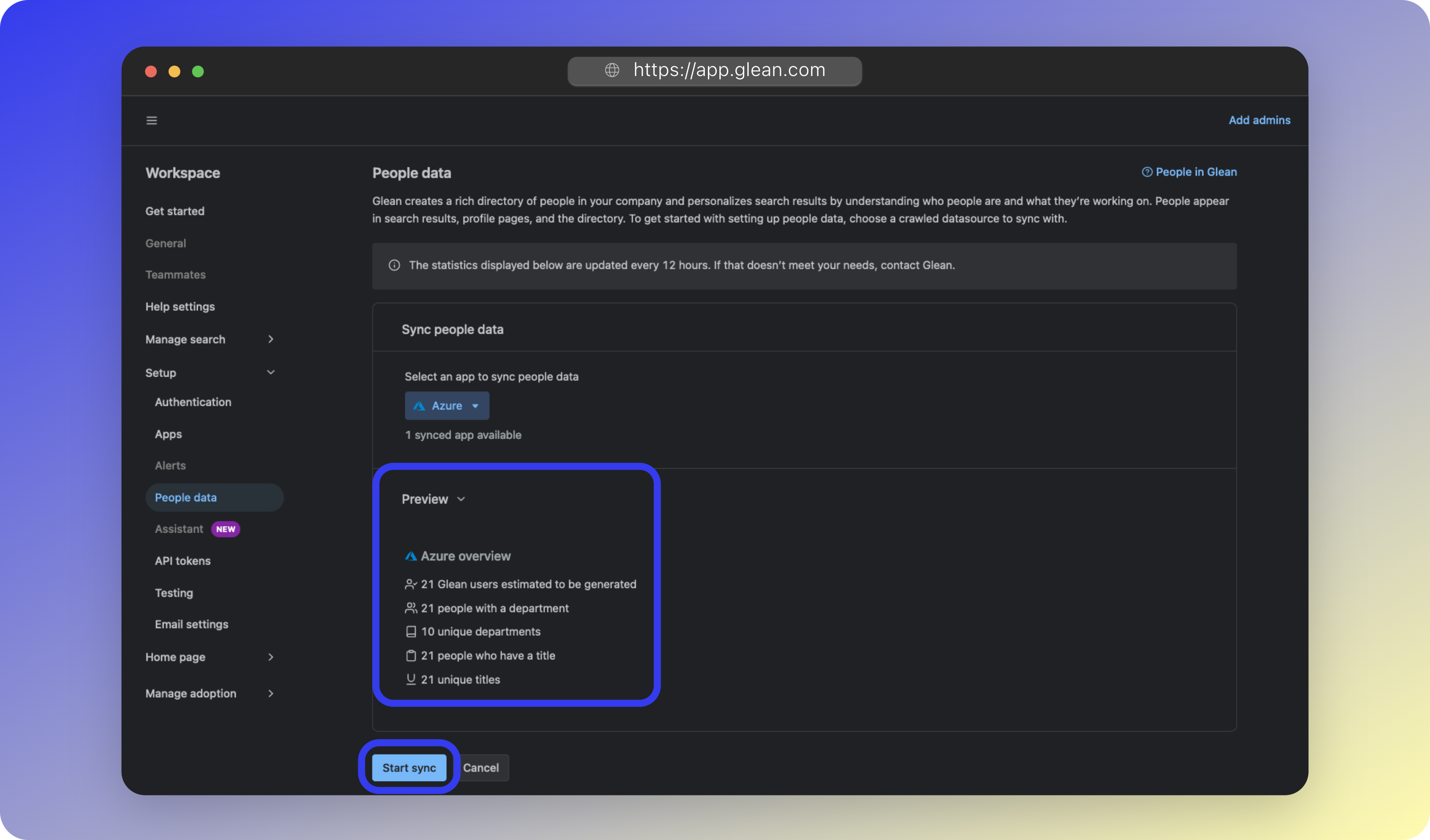 Over the next few hours, you will start to see your users synchronized to Glean under Workspace Settings > Setup > People Data. If 24 hours elapse without any data populating, please contact your Glean engineer or Glean support.