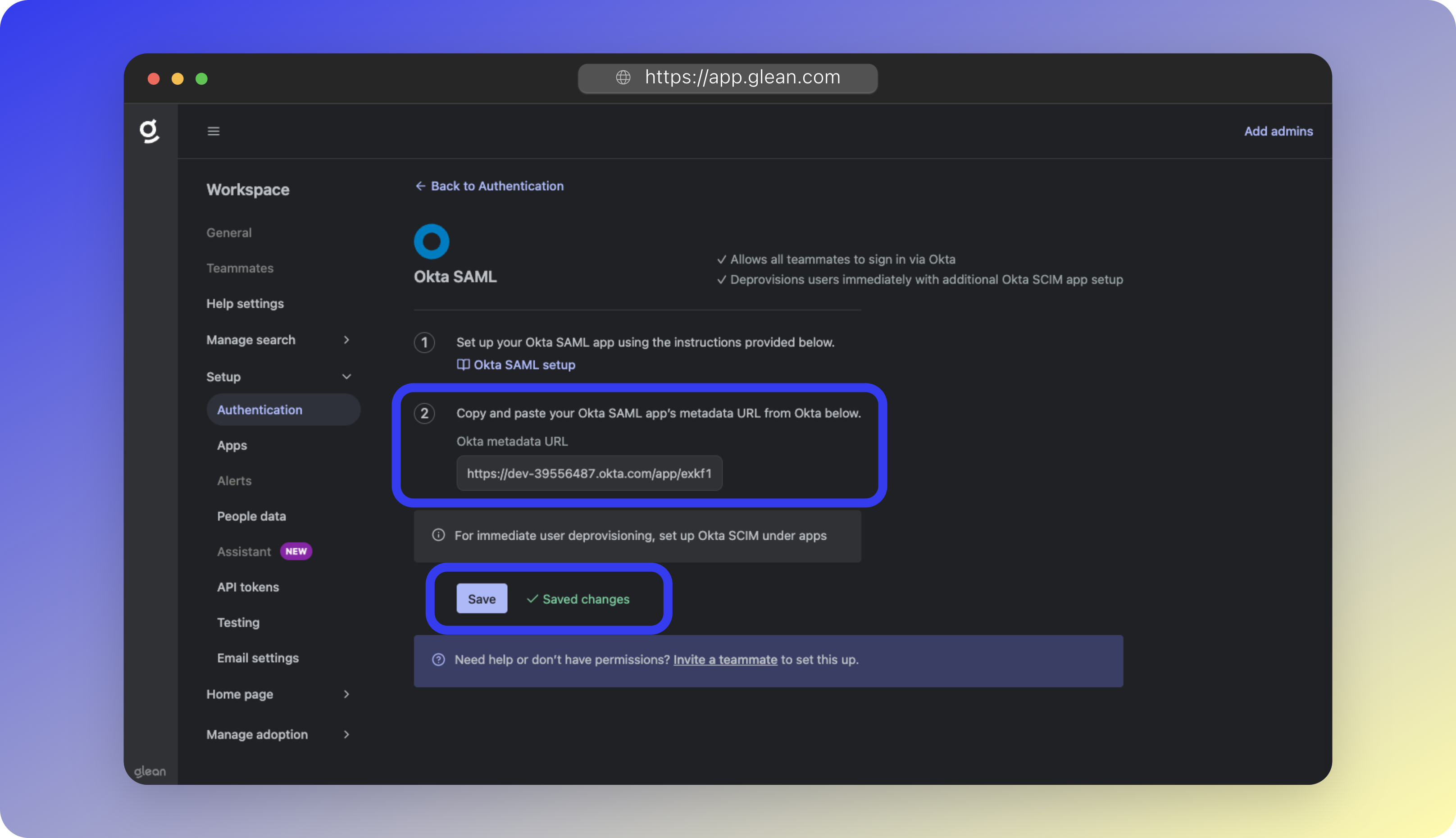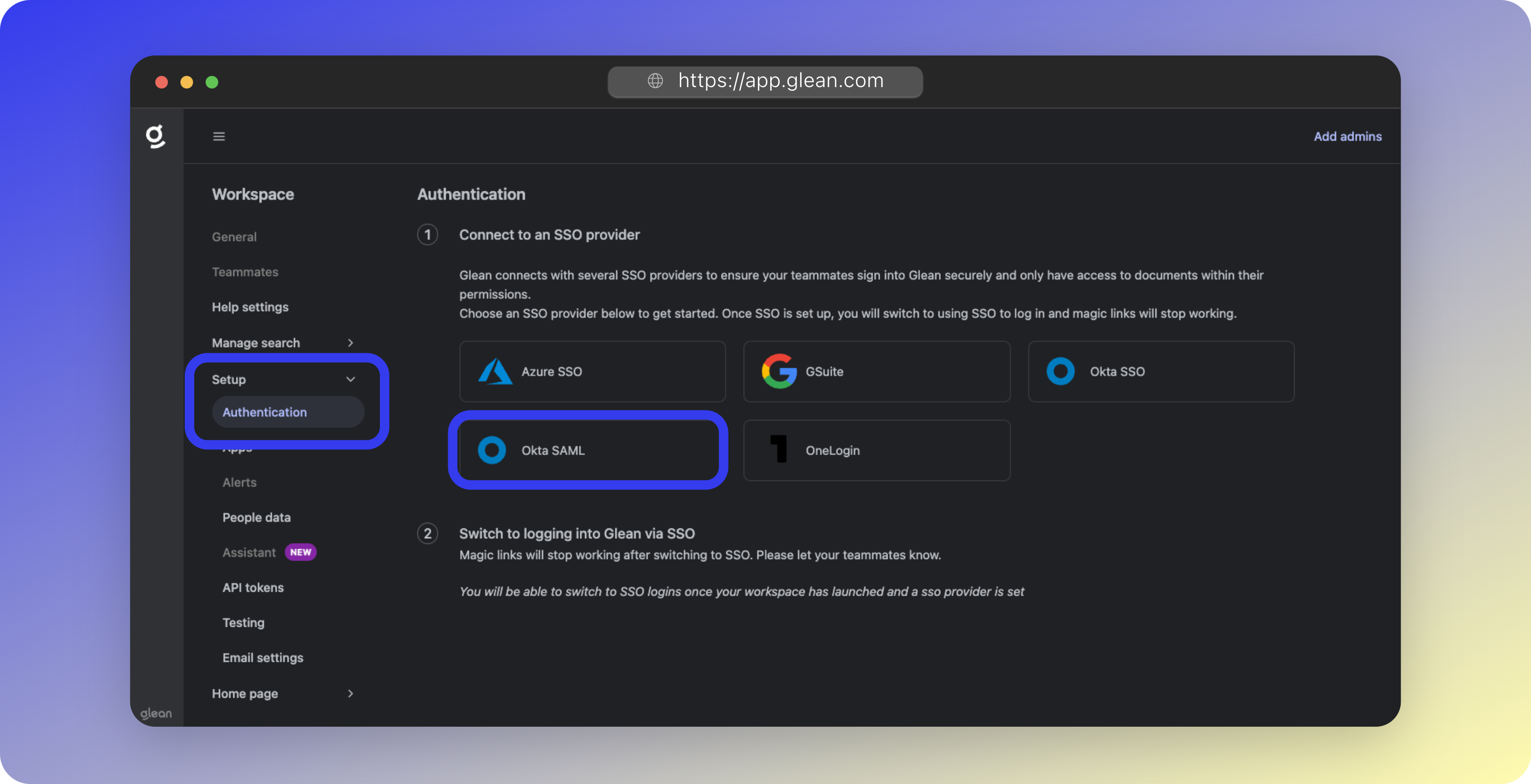 1. In the Glean UI, navigate to Workspace Settings > Setup > Authentication.