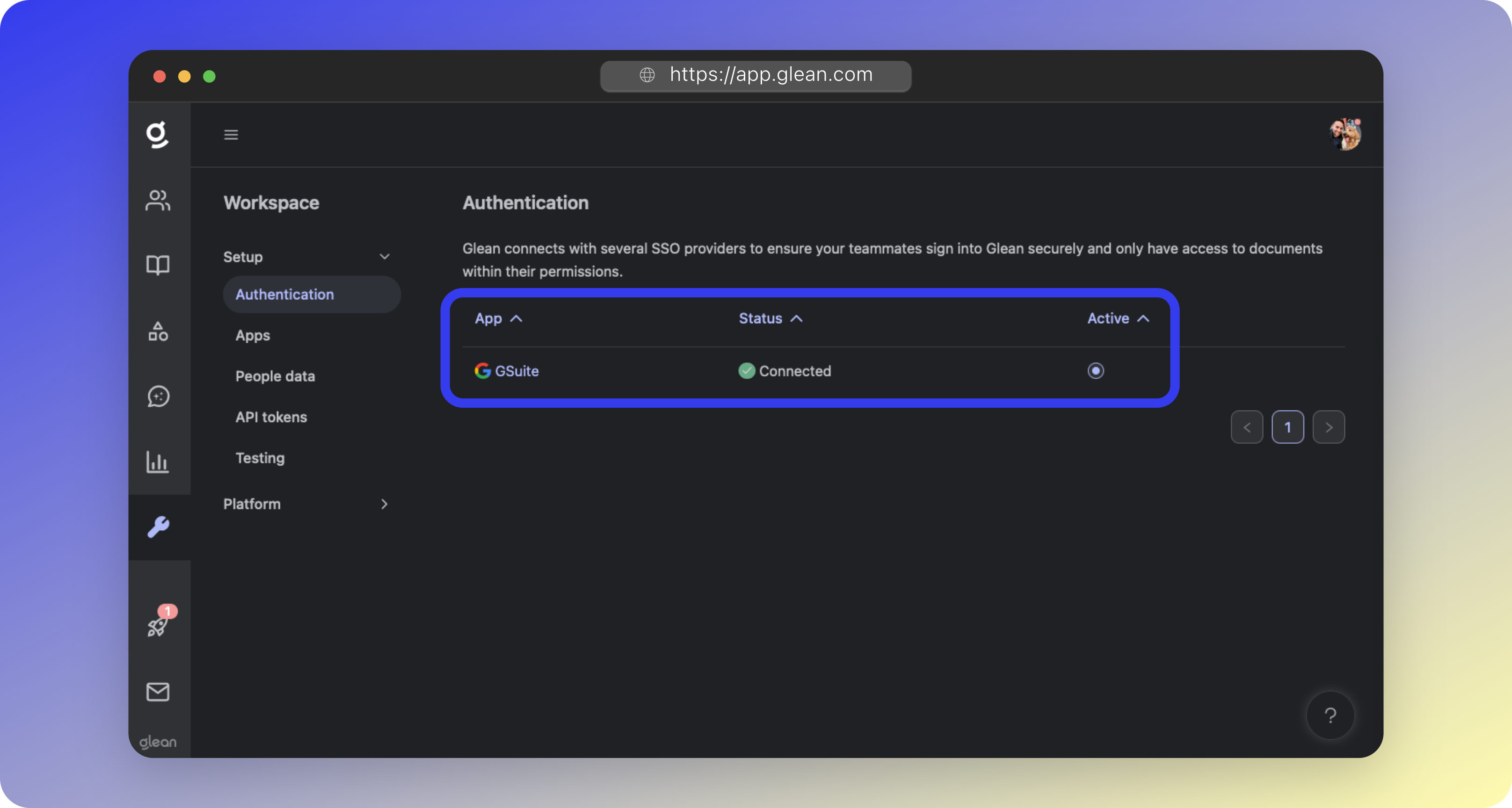 1. In the Glean UI, navigate to Workspace Settings > Setup > Authentication.