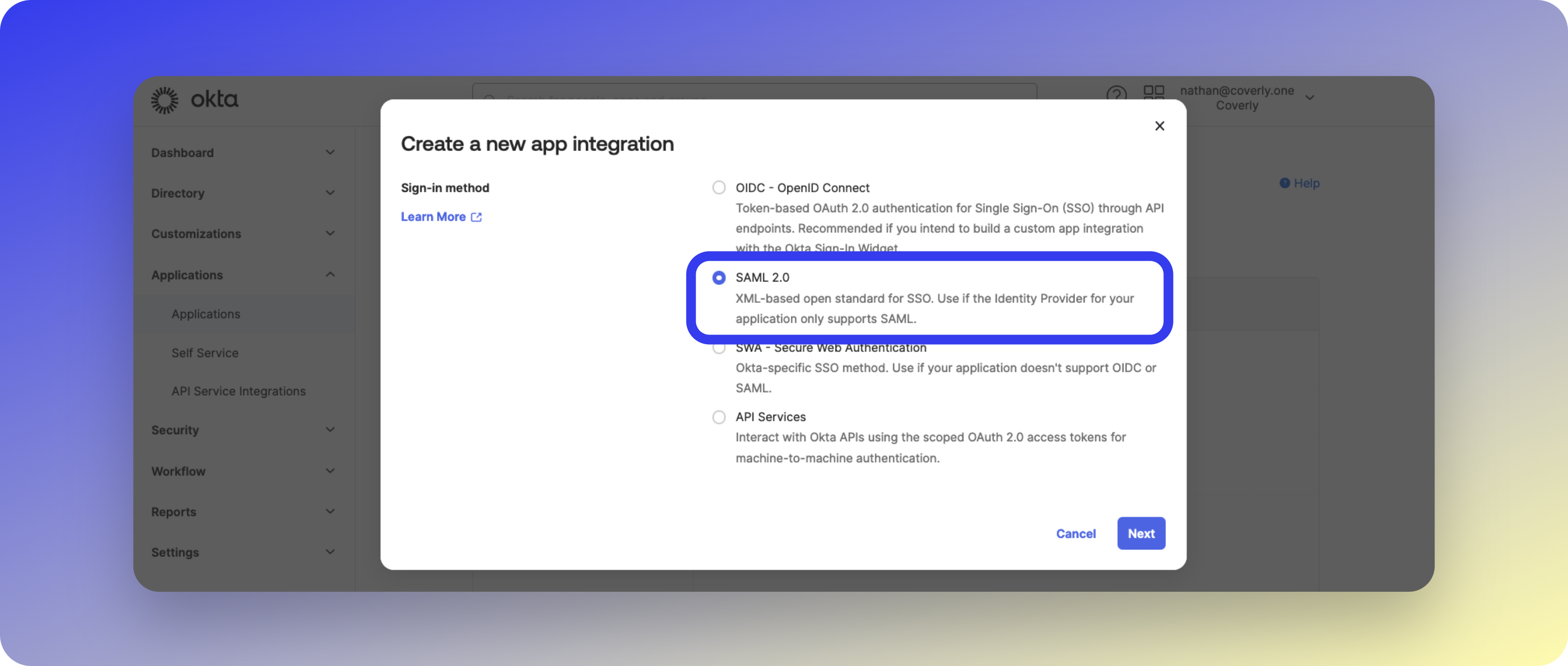 Click the Create App Integration button, then select SAML 2.0 and click Next.
