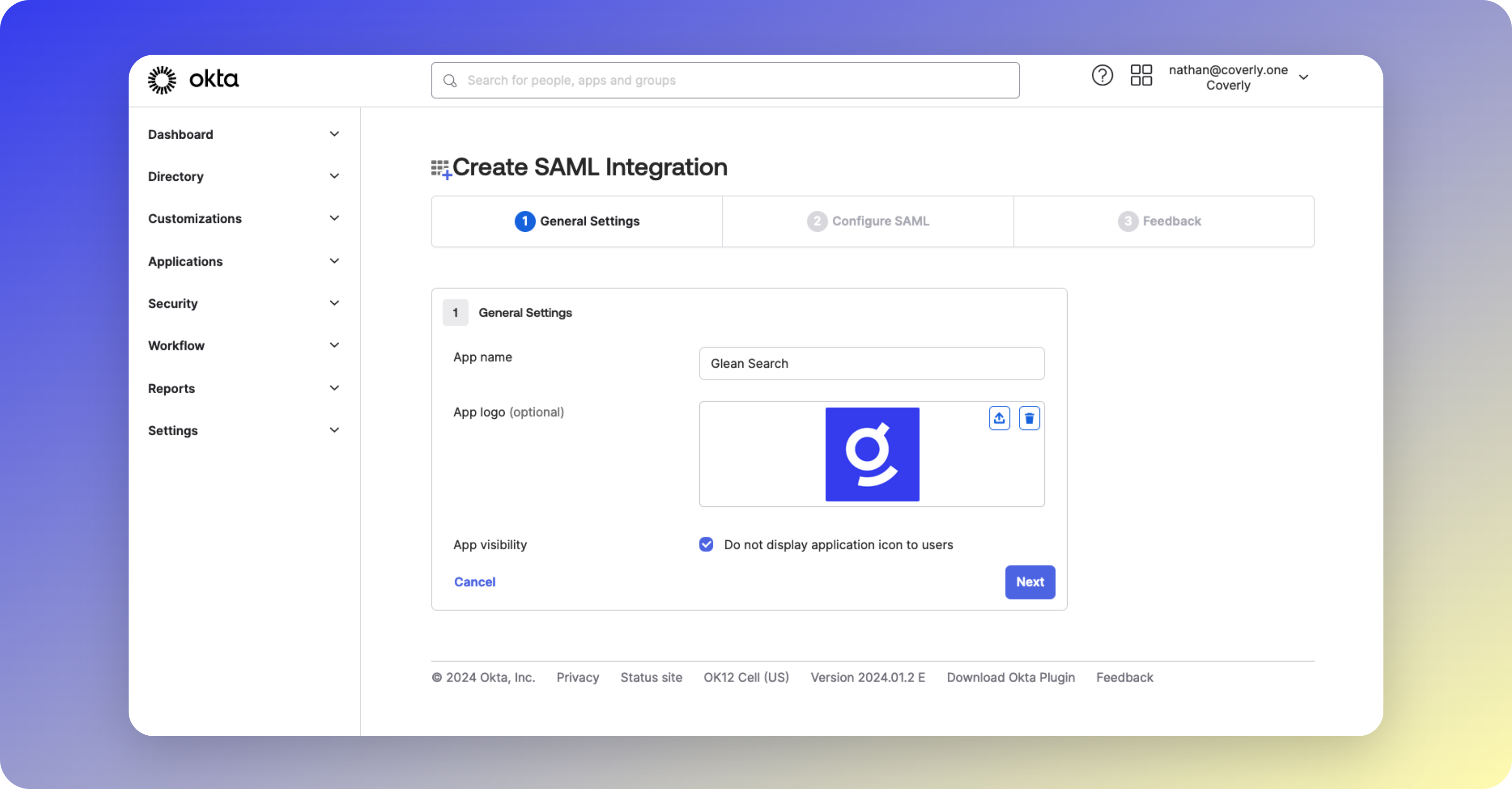 Create a new Application in the Okta Admin Dashboard to complete the SAML integration with Glean.