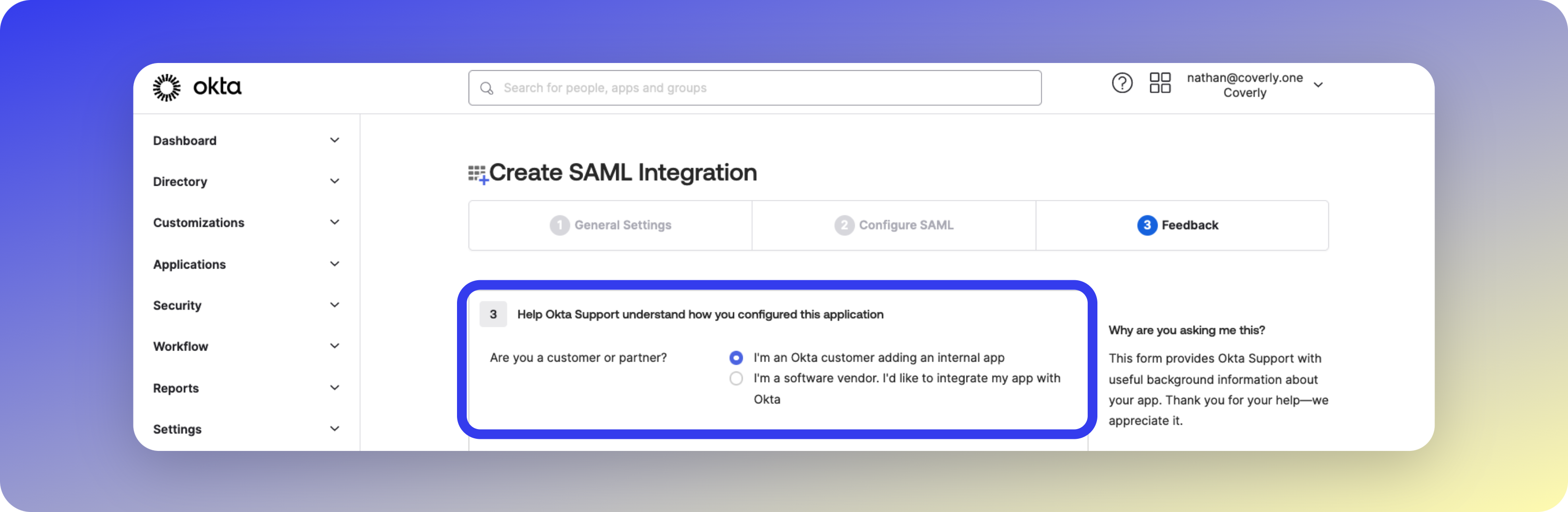 In the next section, under Are you a customer or partner? select I'm an Okta customer adding an internal app.