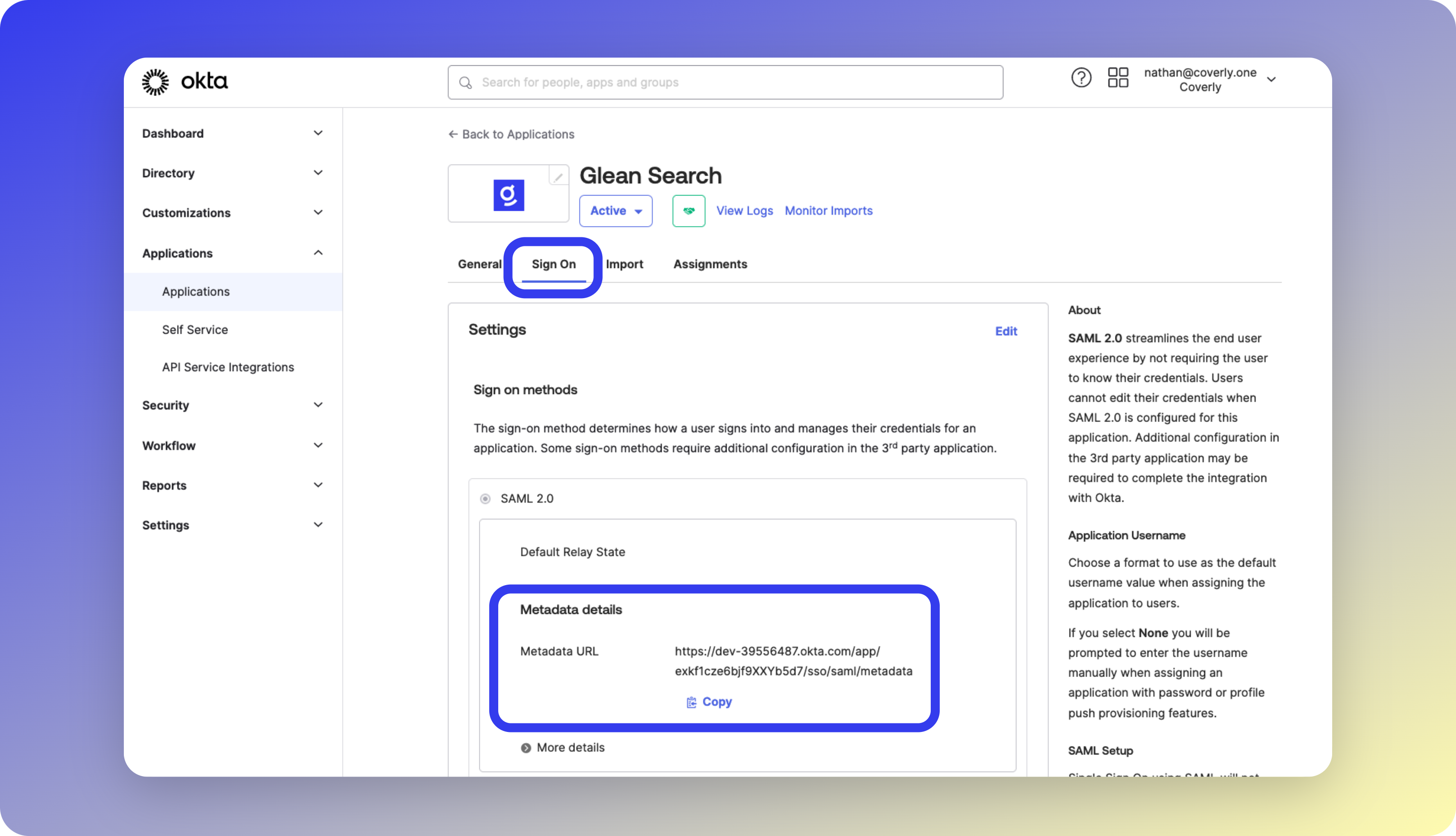 On the next screen, under the Sign On tab, copy the Metadata URL. You will need to paste this into the Glean portal later.