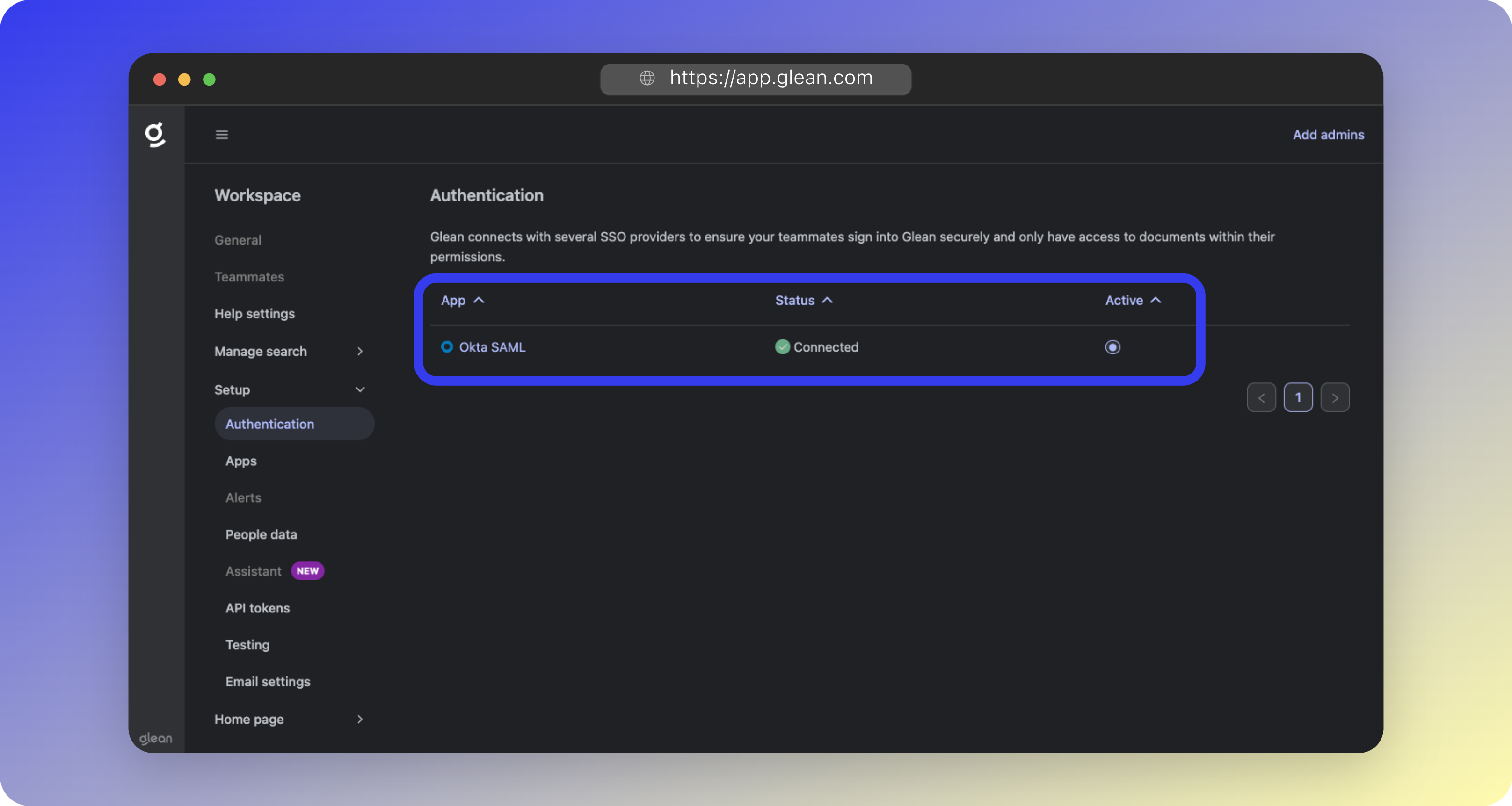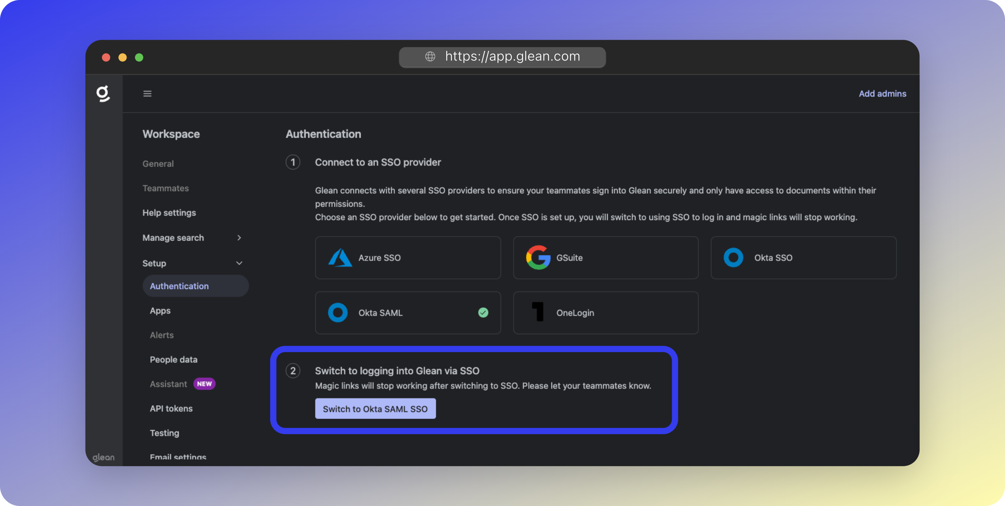 - In the Glean UI, navigate to Workspace Settings > Setup > Authentication