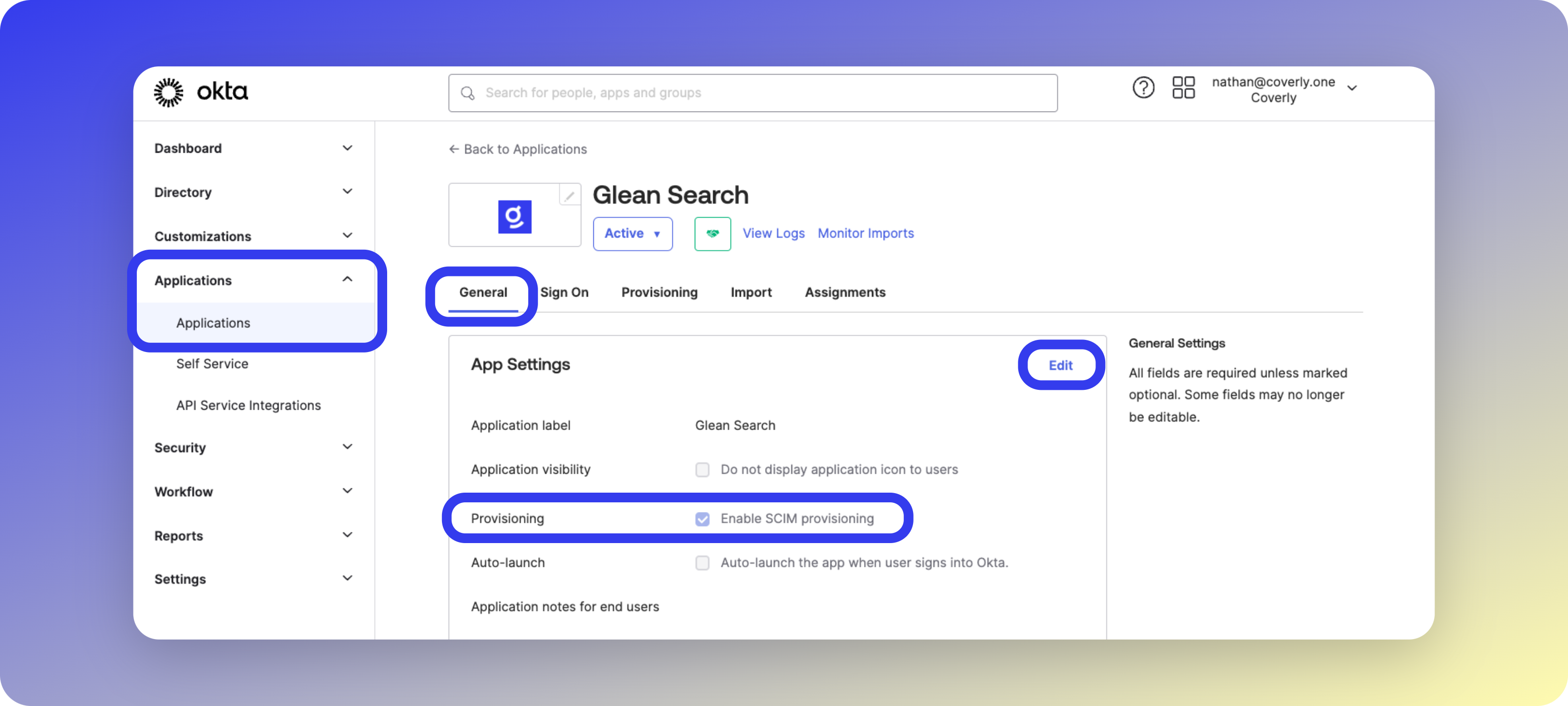 - Navigate to Applications > Applications from your Okta admin dashboard, and select the Glean Search app you created earlier.