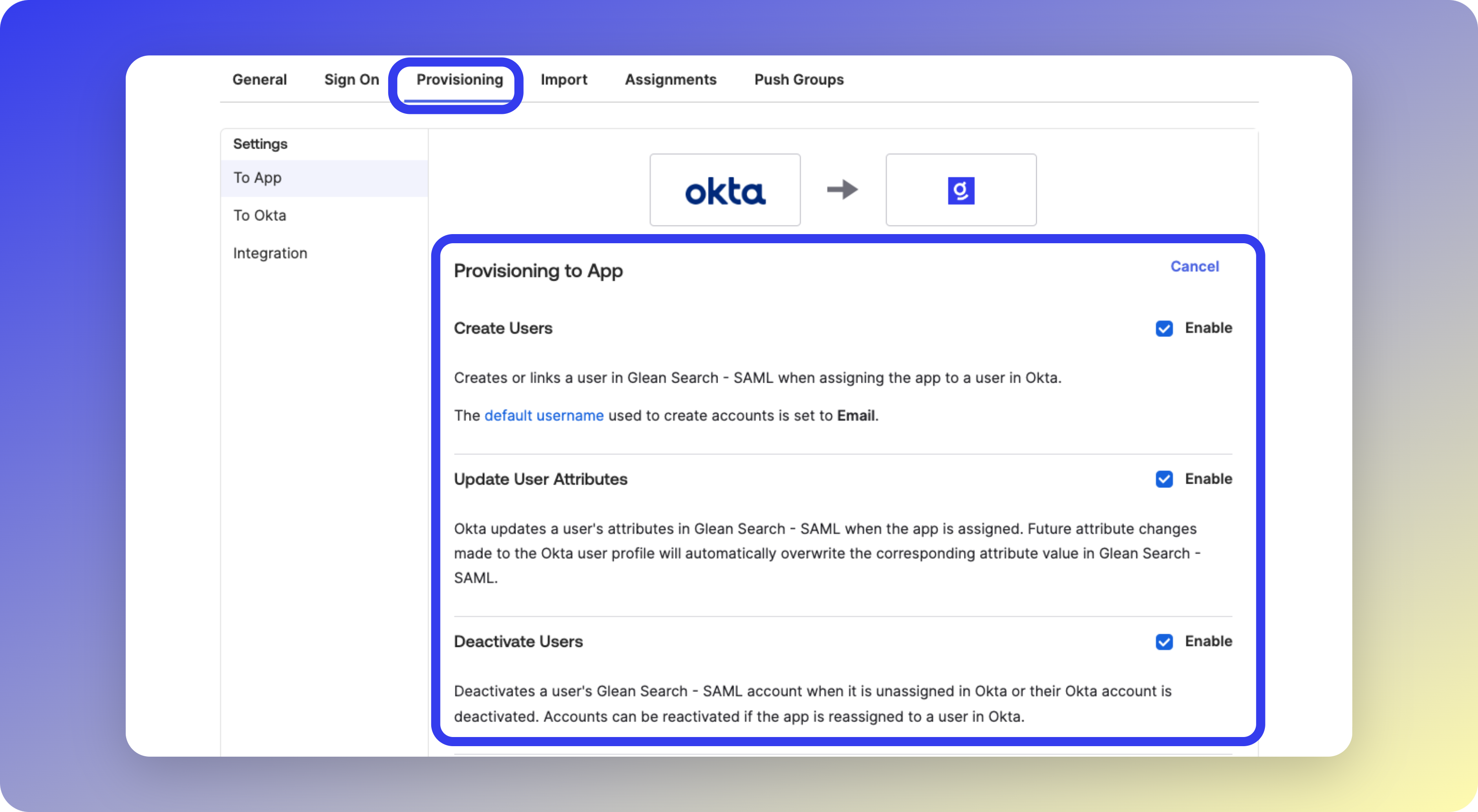 - You have enabled the Create Users, Update User Attributes, and Deactivate Users options under the Provisioning tab for the Glean Search Okta app.