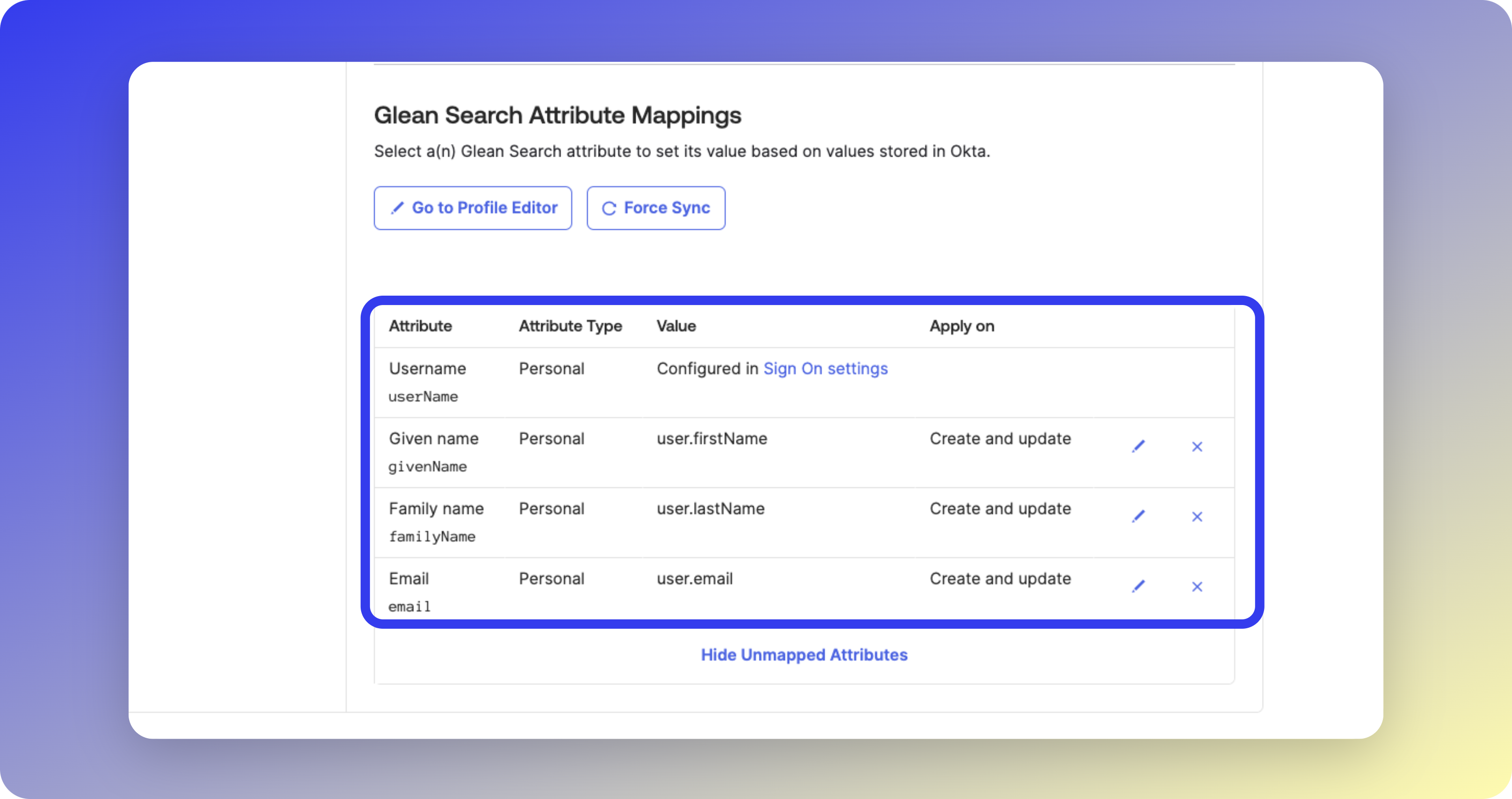 - These options tell Okta what should be pushed to Glean. Not enabling them means that Okta will not push anything.