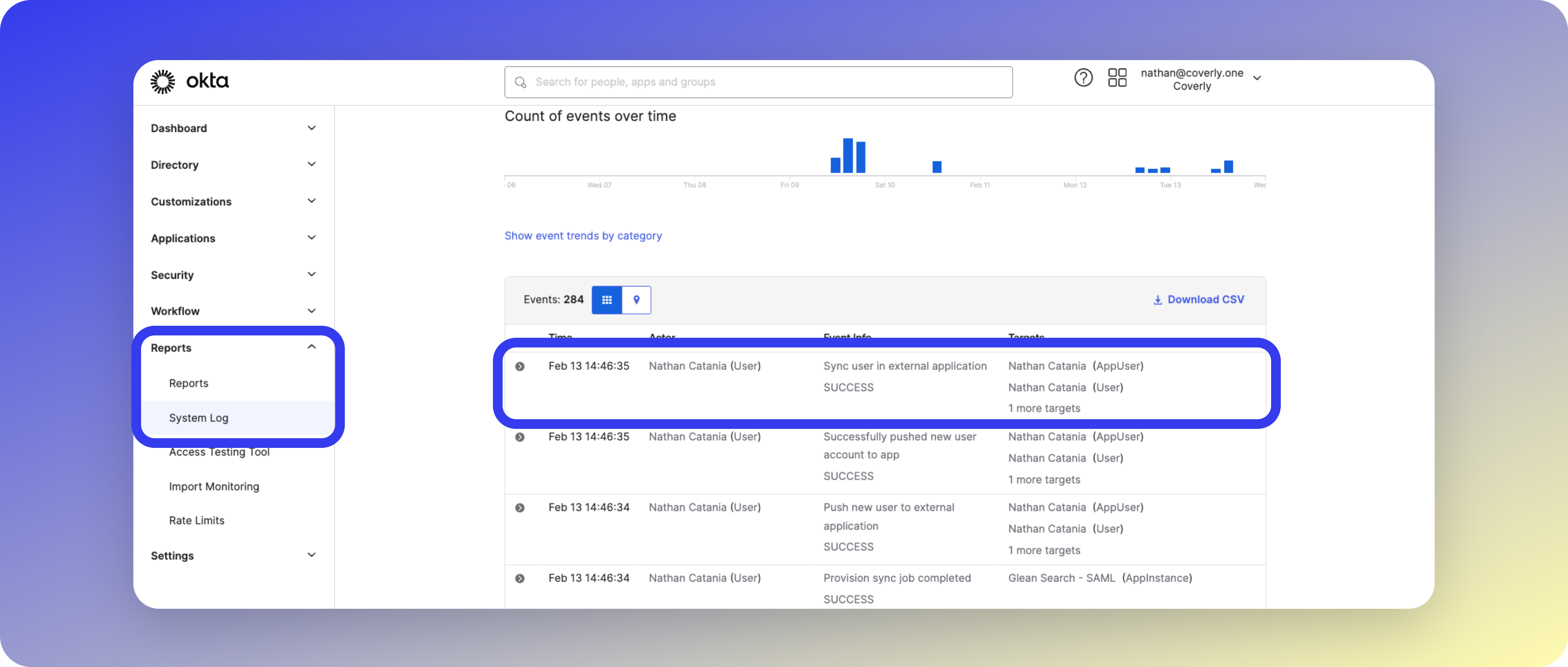 Navigate to Reports > System Log in your Okta admin dashboard.