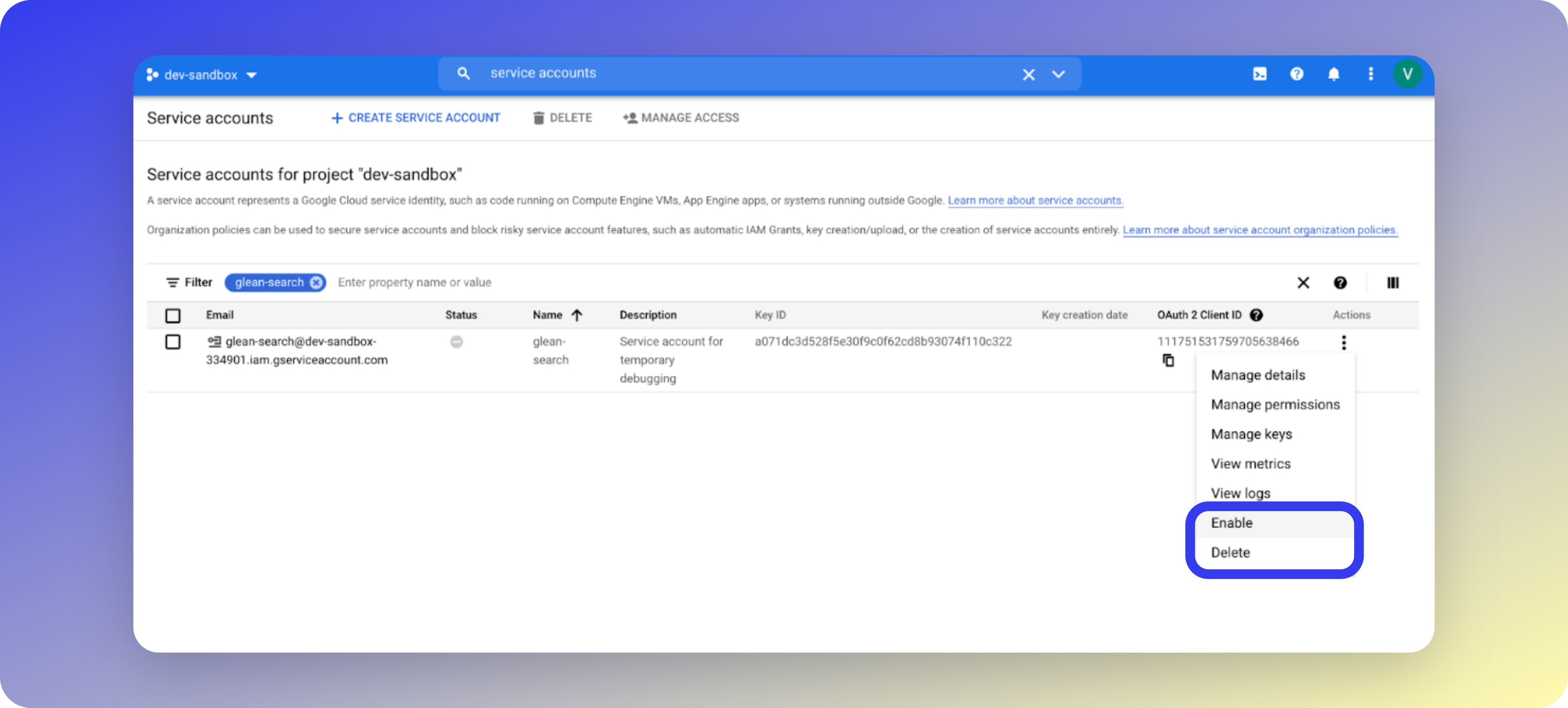 Disabling the account (e.g., glean-admin@<gcp project name>.iam.gserviceaccount.com) will revoke Glean's access to the GCP components that store sensitive company data, such as the CloudSQL databases and the Kubernetes cluster.