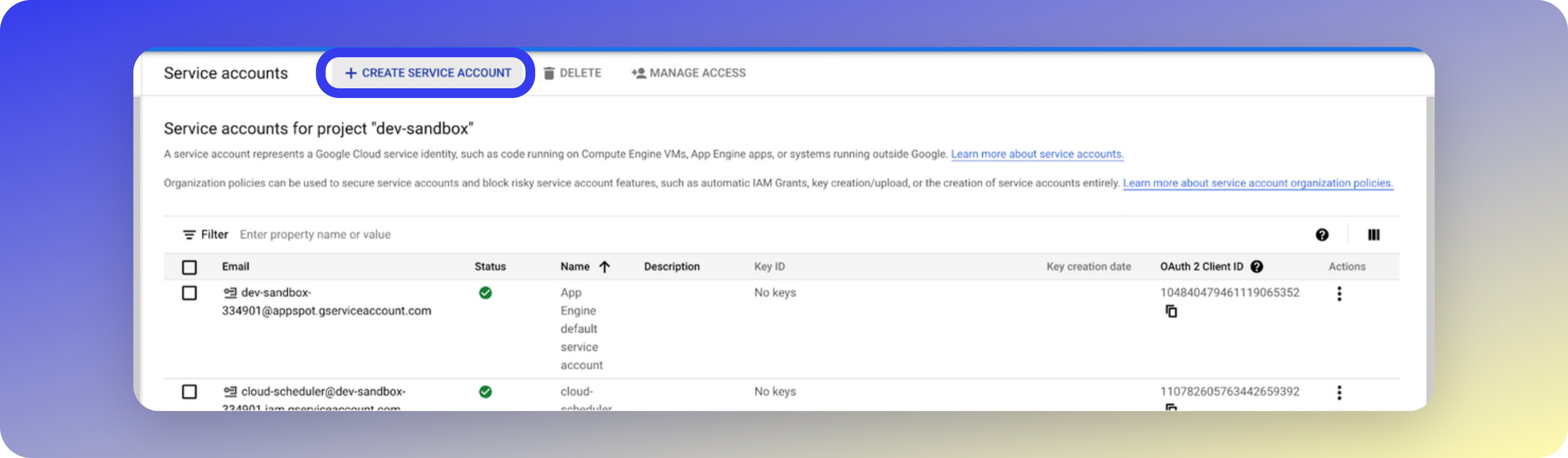 Access to the service account is granted to Glean through a JSON key, which is securely uploaded via the Glean user interface.