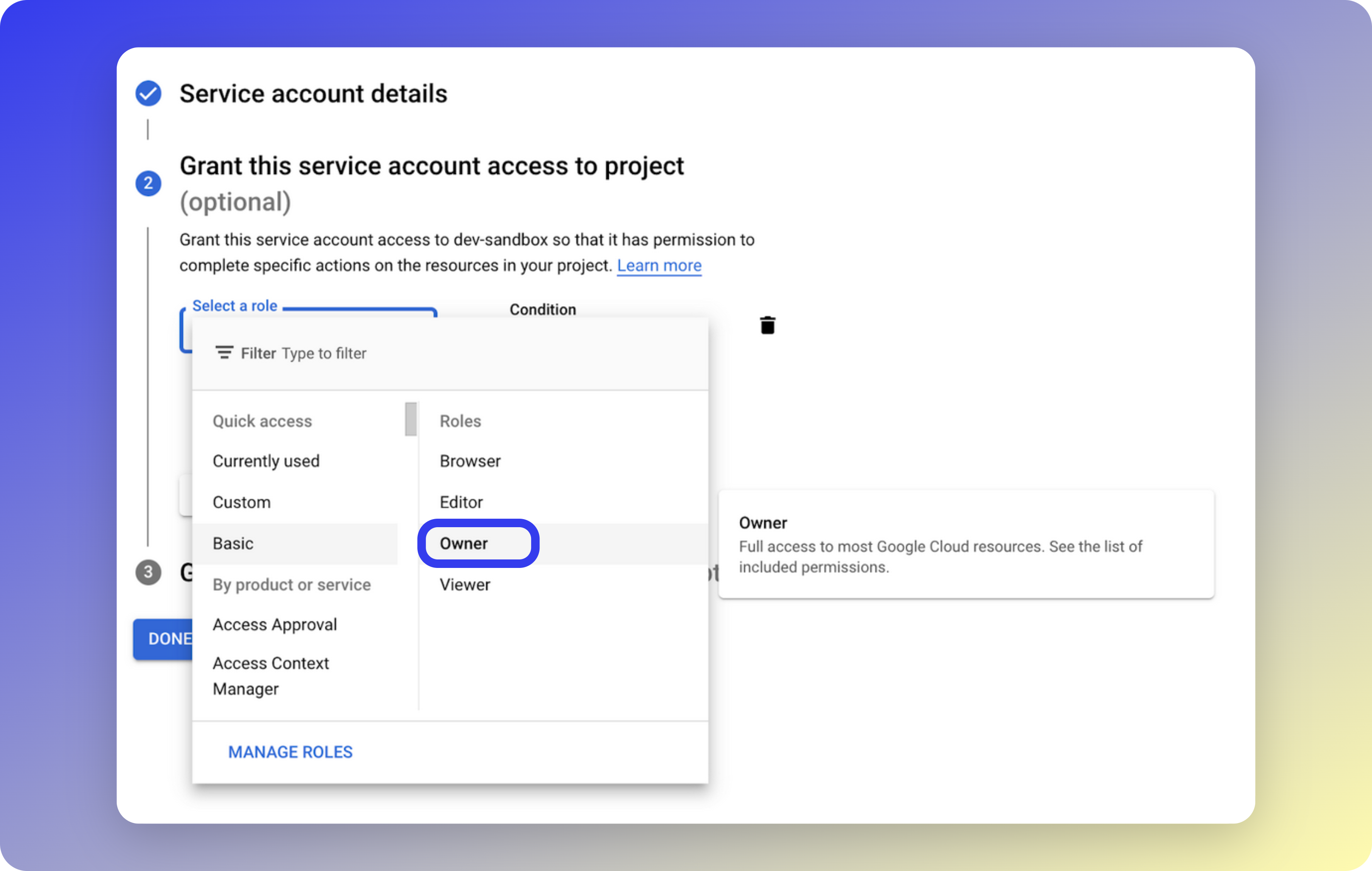 Under the Grant this service account access to project section, select the Owner role from the list and click Continue.