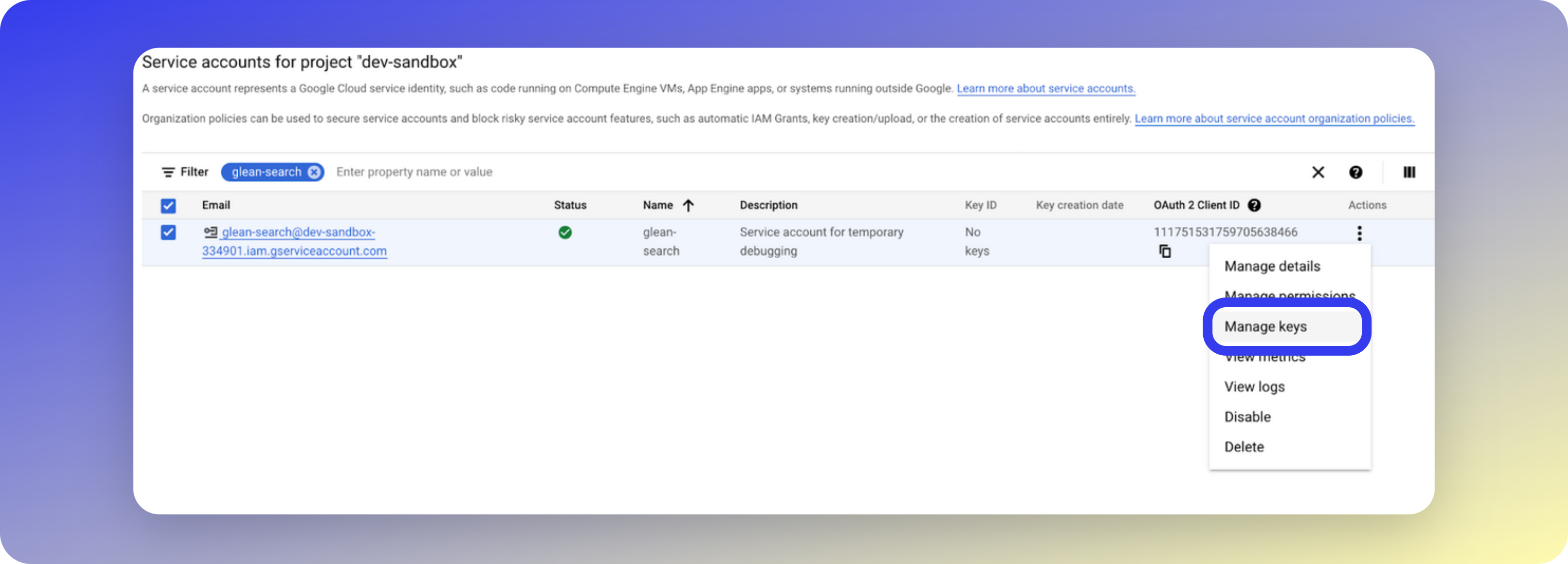 glean-admin. Click the three vertical dots on the right side to open the menu, and select Manage Keys.