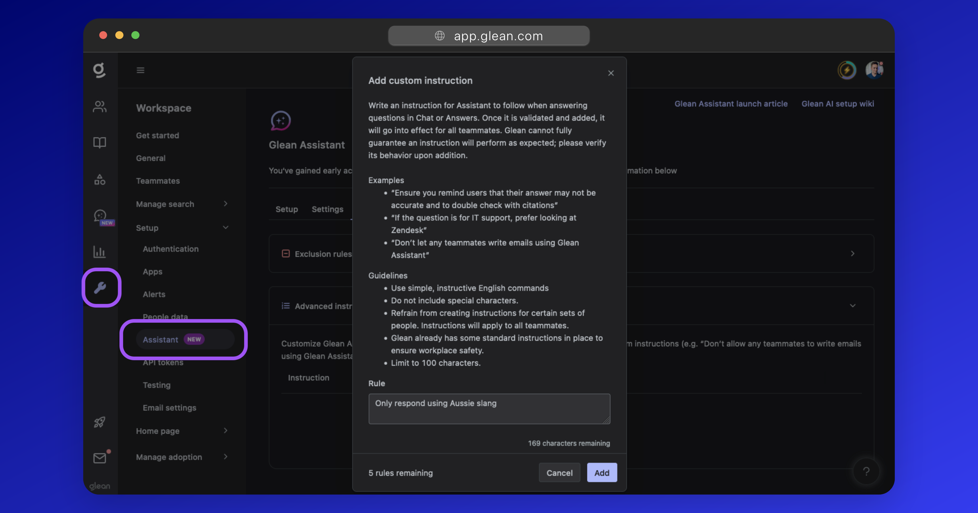 You can optionally provide Glean Assistant with up to 5 custom instructions to better align its behavior with your enterprise requirements.
