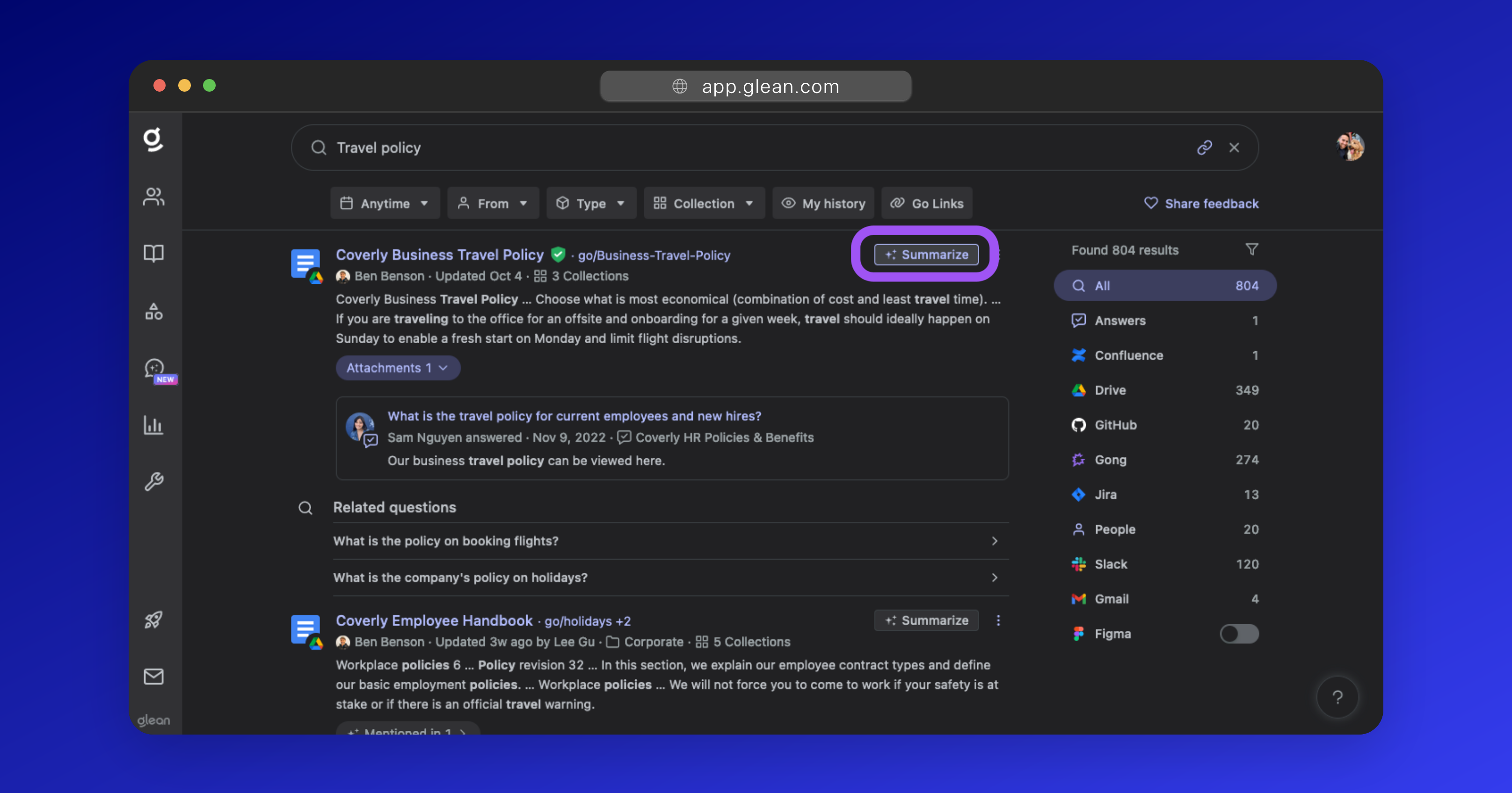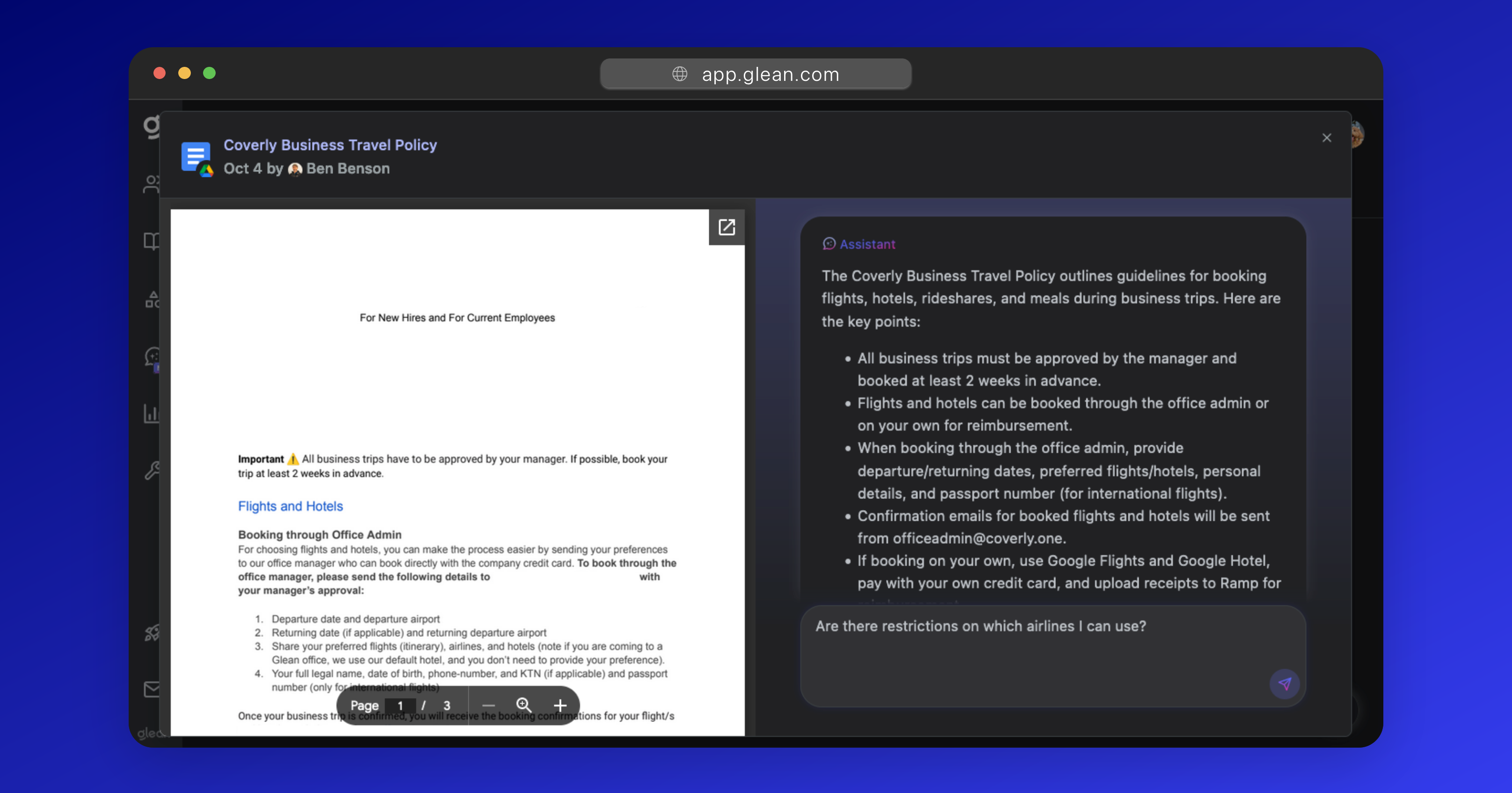 Glean Assistant will then summarize the contents, with the user being able to ask follow-up questions regarding the document contents.