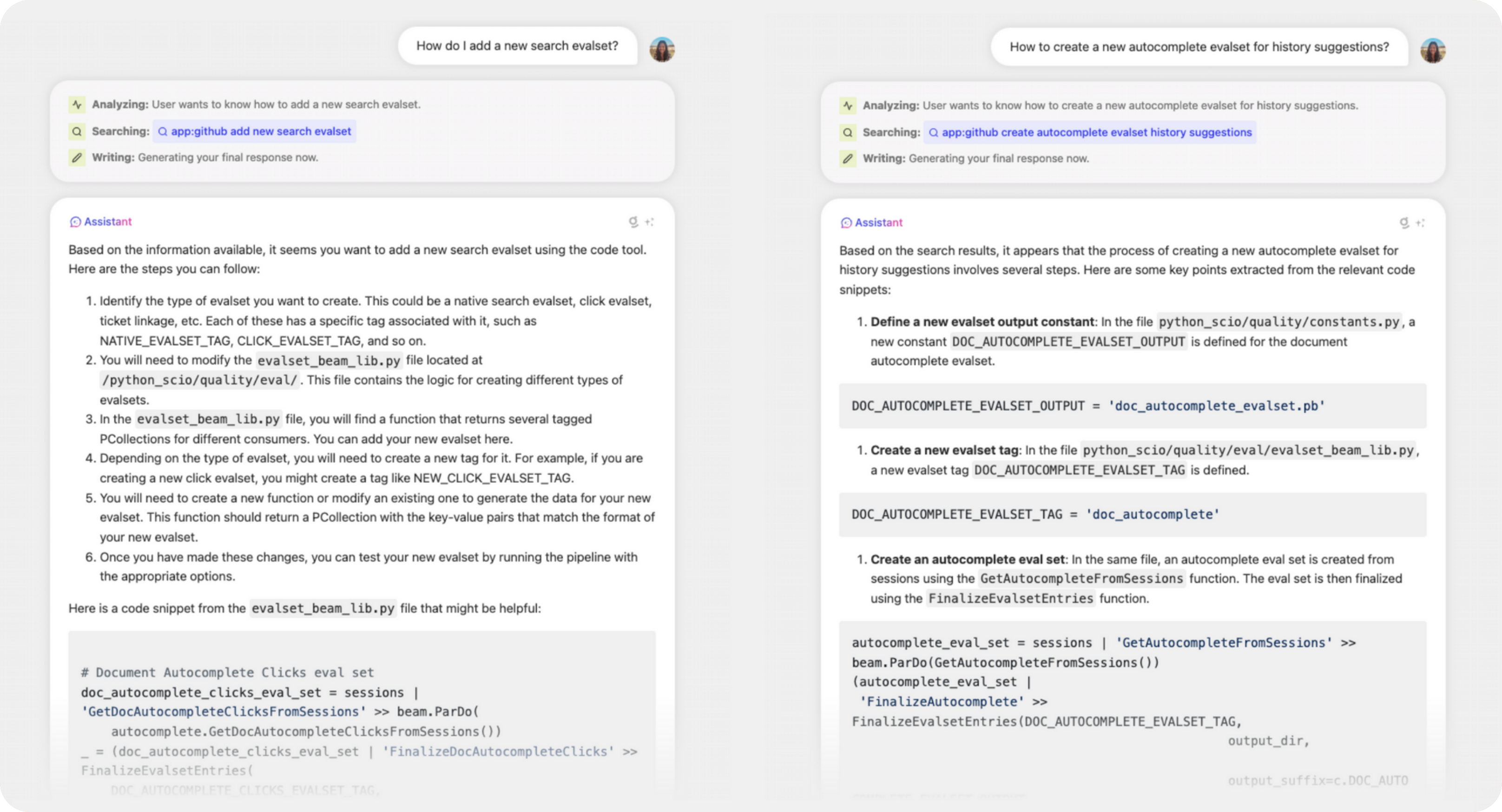 Glean Assistant will find the relevant files where the changes need to be made, along with explanations on what those changes are. It will then help write code snippets that can either be copy/pasted or adapted further by the engineer.