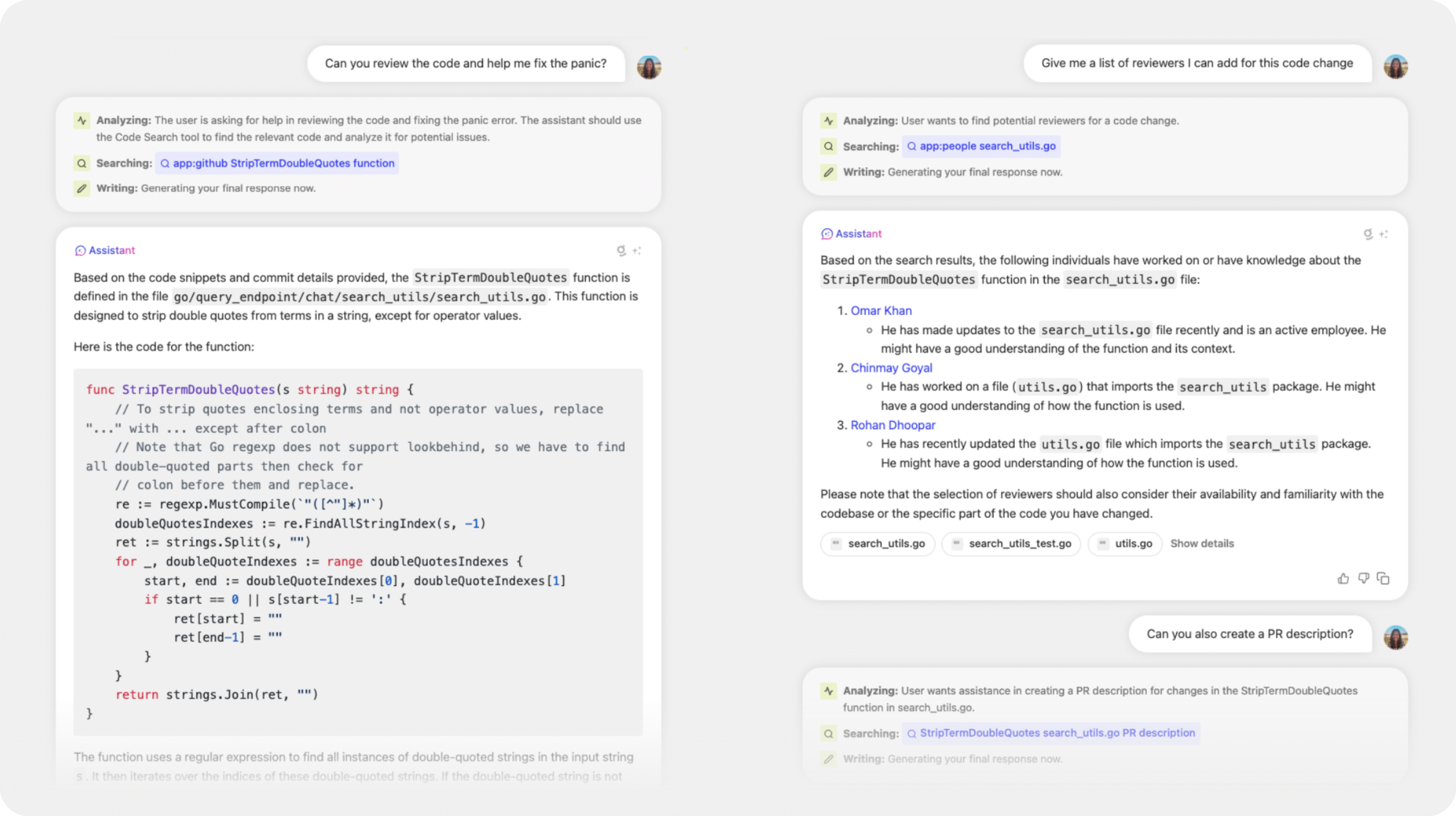 Glean Assistant helps the user locate the cause of the panic by analyzing the stack trace. On further prompts by the user, it suggests a fix for the panic, and helps them craft a PR to implement the fix.
