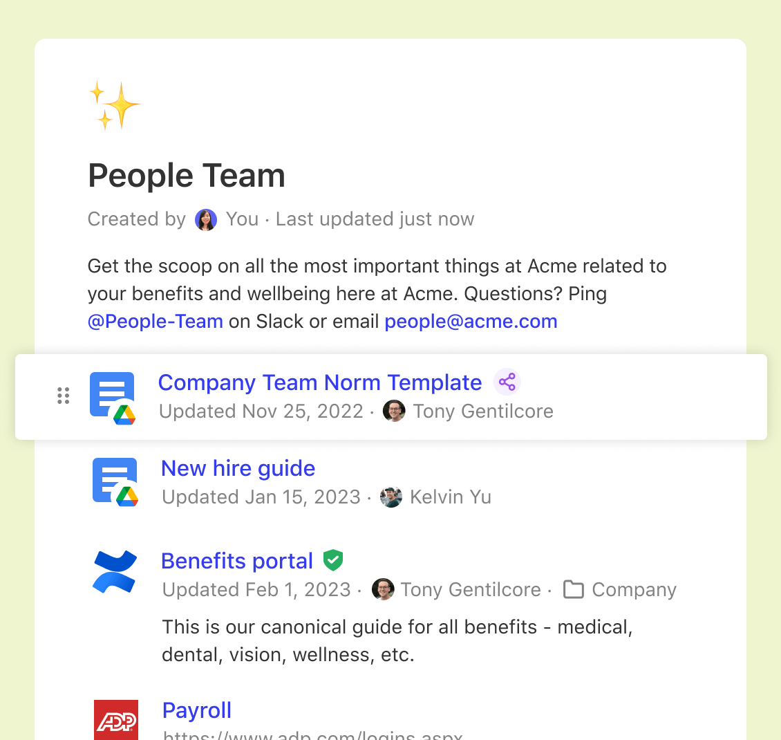 Organize a set of links, write useful descriptions about them, and share the whole package with the rest of the organization. Collections can be featured in the Work Hub page and targeted at different audiences; providing a single source of truth for useful resources.